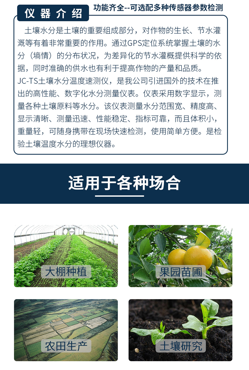 JC-TR-4G 土壤水分、温度、盐分速测仪采用一体化结构设计,主机可以实时采集被测环境土壤的水分、土壤温度、盐分、PH等多个参数。广泛应用于土壤墒情检测、旱作节水灌溉、精细农业、林业、地质勘探、植物培育、水利、环保等ling域。