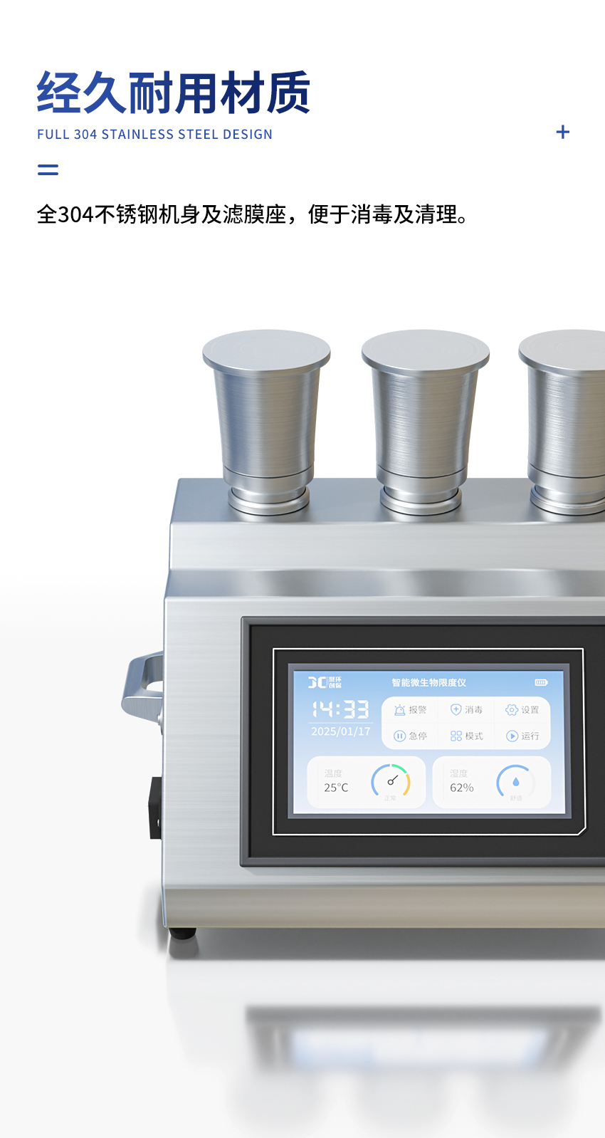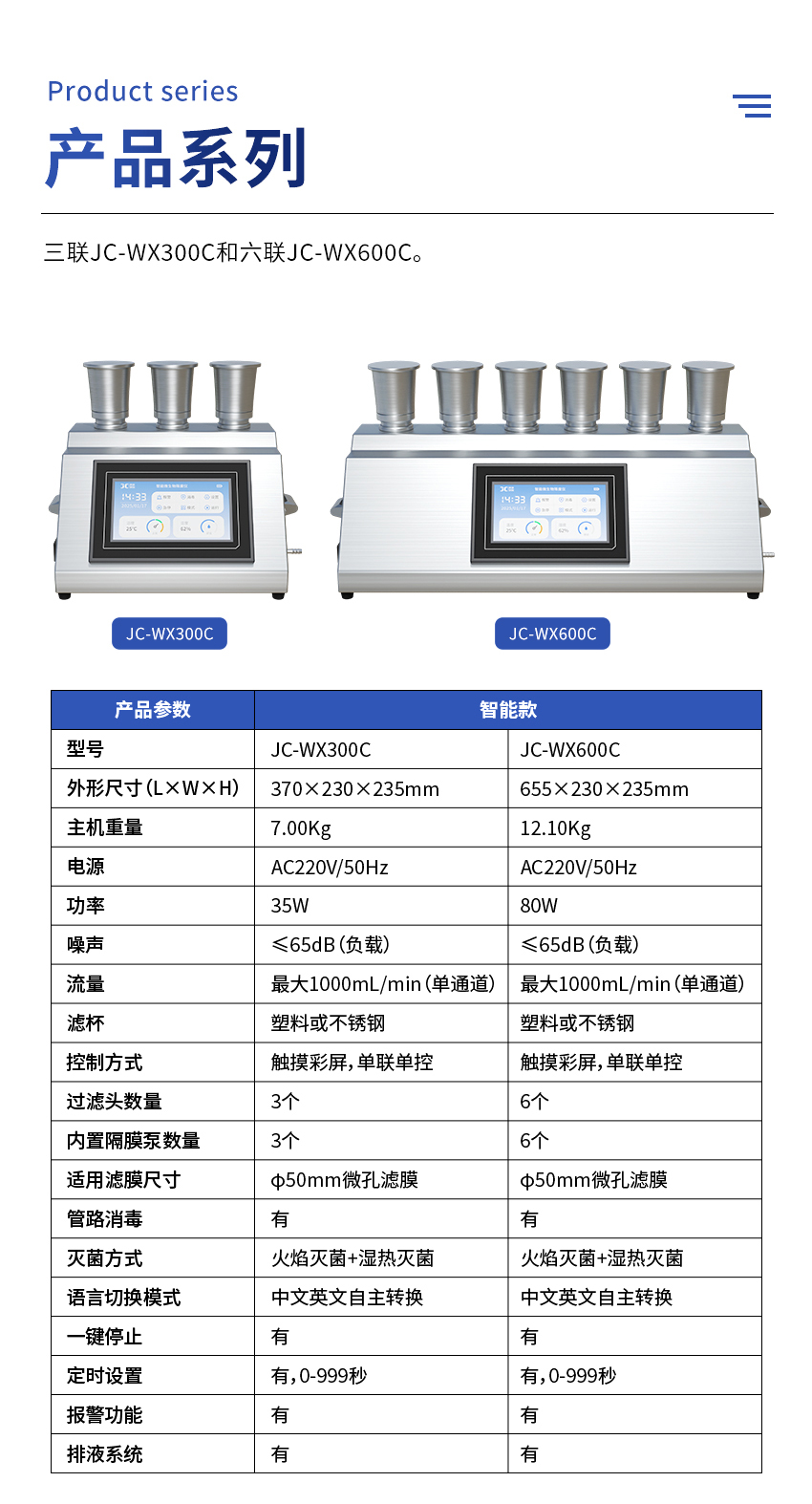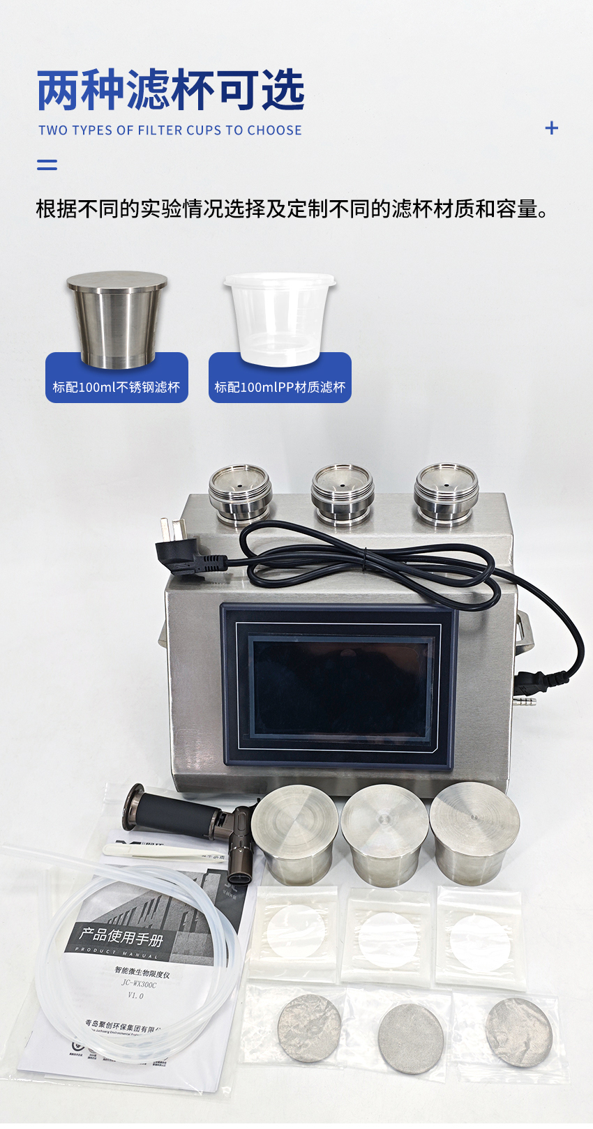 聚创智能三联微生物限度仪JC-WX300C基于薄膜过滤法的原理,与微生物培养器(M50)配套使用,通过液泵的抽滤作用,在系统内部形成负压,供试品在压差作用下被过滤,可能存在的微生物被滤膜截留,通过冲洗滤膜(如有必要),除去抑菌成分,然后反浇培养基进行培养,已检验供试品含菌量。主要用于各类水质、药品、食品等介质中微生物检测及实验室中进行除菌、除微粒等。具有操作过程不易受到污染、易于清洁等特点。