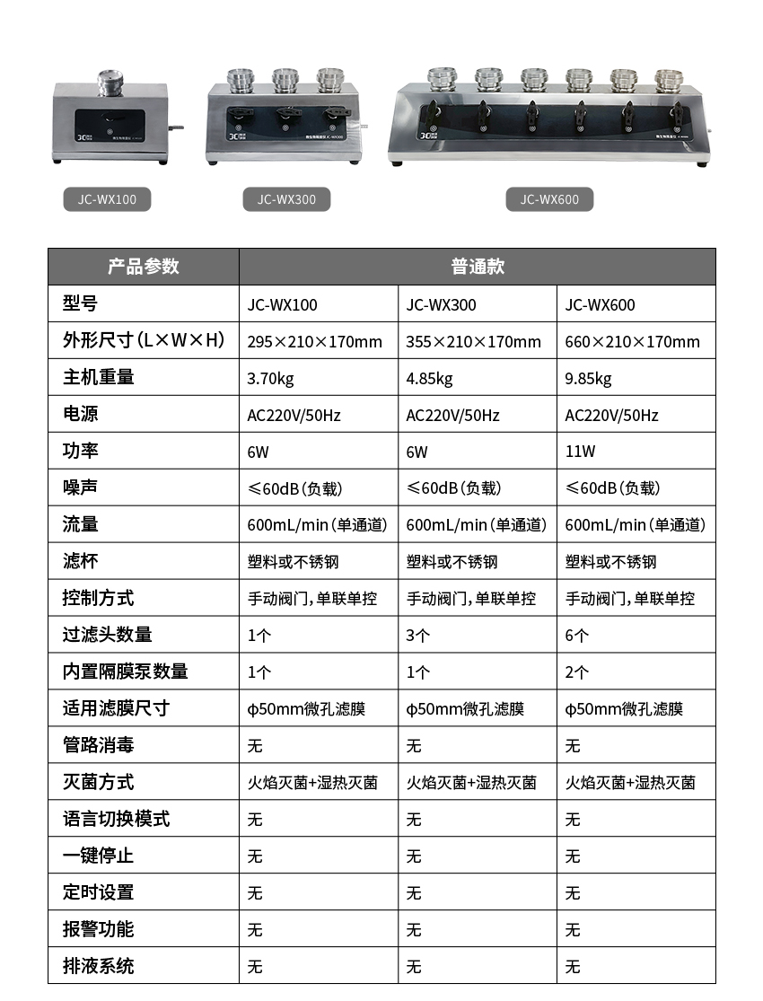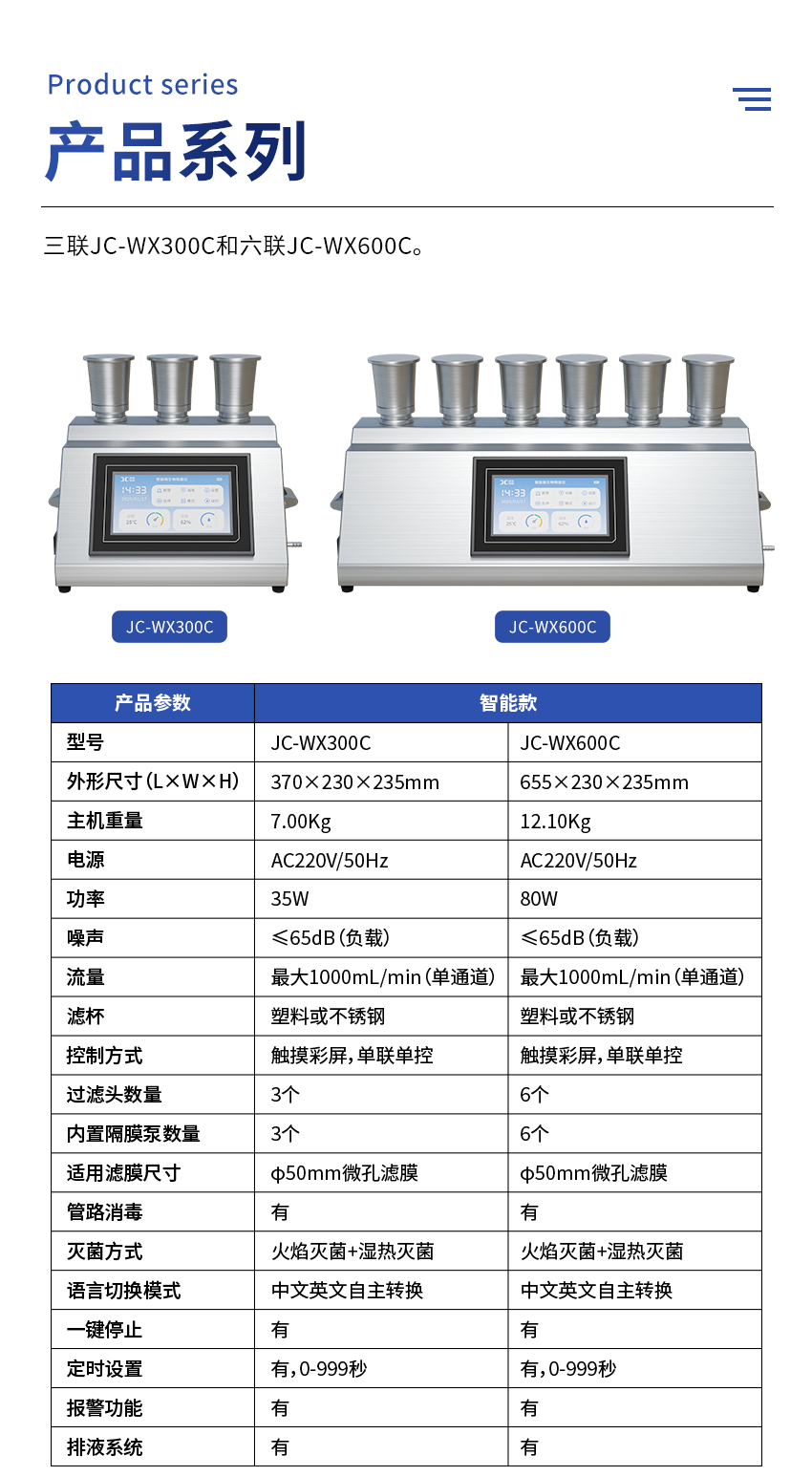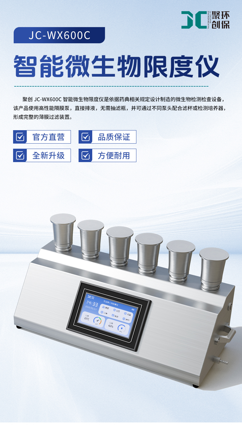 聚创智能六联微生物限度仪JC-WX600C基于薄膜过滤法的原理,与微生物培养器(M50)配套使用,通过液泵的抽滤作用,在系统内部形成负压,供试品在压差作用下被过滤,可能存在的微生物被滤膜截留,通过冲洗滤膜(如有必要),除去抑菌成分,然后反浇培养基进行培养,已检验供试品含菌量。主要用于各类水质、药品、食品等介质中微生物检测及实验室中进行除菌、除微粒等。具有操作过程不易受到污染、易于清洁等特点。