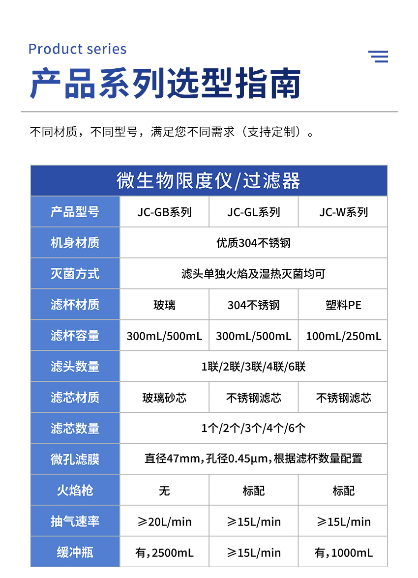 JC - W型仪器是用于对“包含少量微生物污染”水样进行微生物检测的新一代设备。它广泛应用于环境监测,以及食品及饮料工业、化妆品和制药工业的水中微生物质量控制领域。该仪器是遵照国家标准《GB5750 - 2006生活饮用水标准检验方法 微生物指标》和《GB/T 8538 - 2008饮用天然矿 泉水检验方法》进行水中微生物检测的必备实验器材。