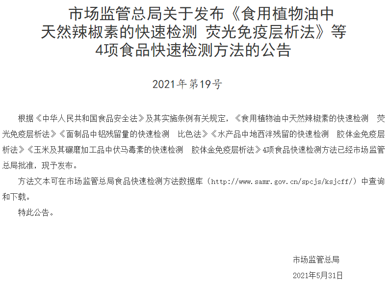 为打击食品非法添加、掺假掺杂行为以及规范食品快检方法使用,强化食品安全监管技术支撑,近日,市场监管总局发布了4项食品快速检测方法,其中包括《食用植物油中天然辣椒素的快速检测 荧光免疫层析法》、《面制品中铝残留量的快速检测 比色法》、《水产品中地西泮残留的快速检测 胶体金免疫层析法》、《玉米及其碾磨加工品中伏马毒素的快速检测 胶体金免疫层析法》。