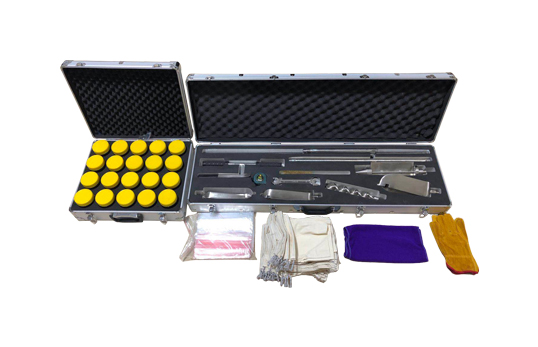 1个T型手柄、1个0.3米延长杆、1个0.6米延长杆、1个1米延长杆、1个沙土钻头、1个粘土钻头、1个多石土钻头、1个泥浆钻头、1个螺旋钻头、1把刮刀、2个扳手、1个钢卷尺、1副手套、1个毛刷、1块毛巾、100个布质样品袋、100个PVC样品袋、1箱有机样品瓶(20个/箱)、1个铝箱