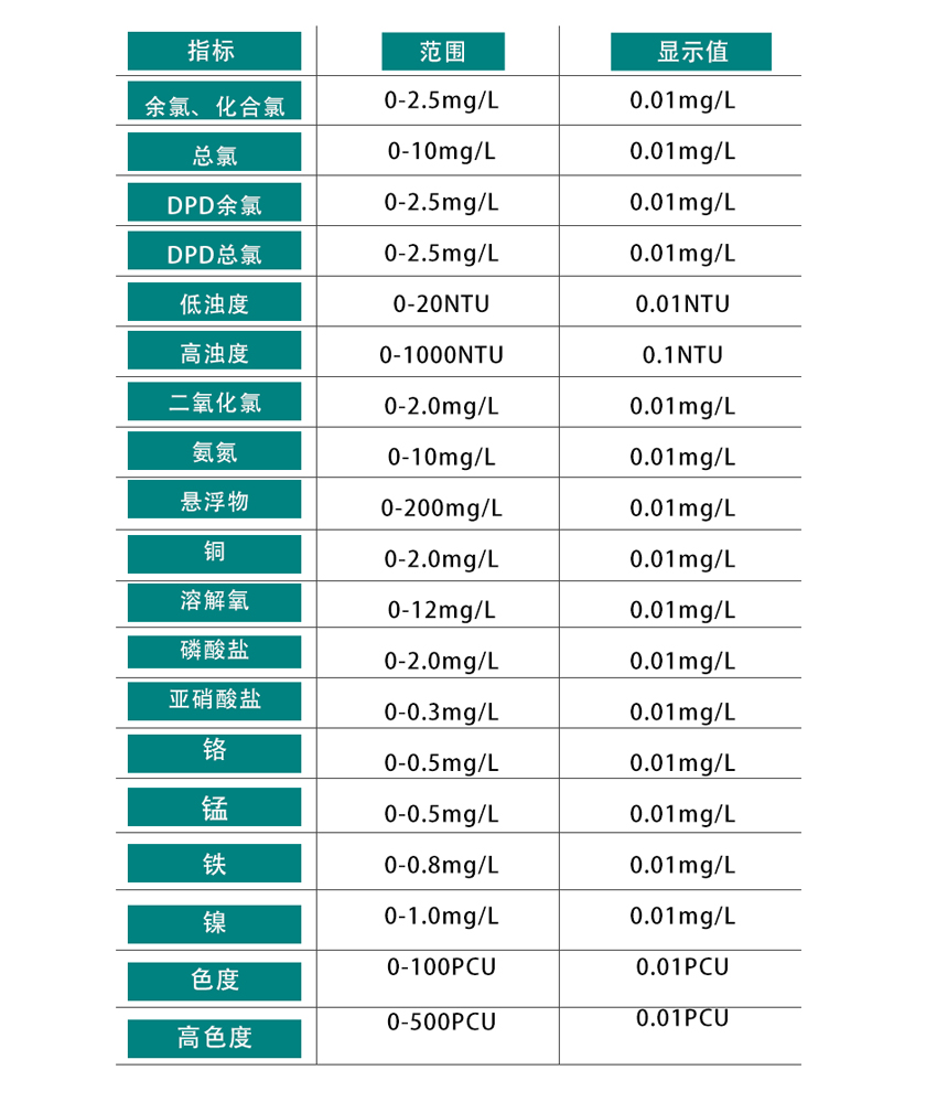 | 余氯、化合氯 | 0-2.5mg/L | 0.01mg/L |