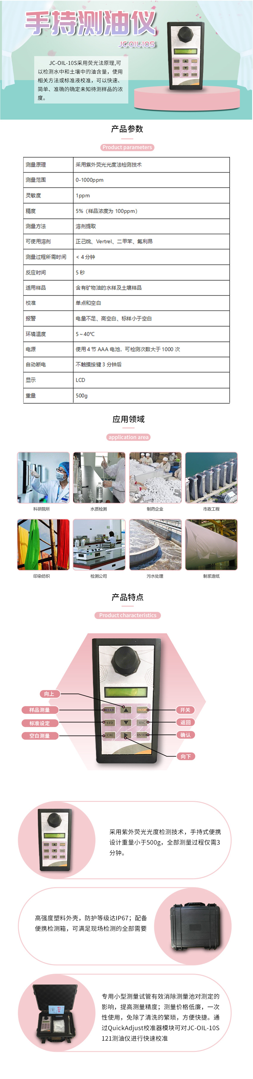 JC-OIL-10S采用荧光法原理,可以检测水中和土壤中的油含量,使用相关方法或标准液校准,可以快速、简单、准确的确定未知待测样品的浓度。