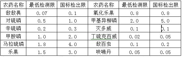 通过大量标准品对照实验,确定试剂的低检出限,农药残留快速检测试剂对几种常见农药的低检测限及国标要求检出限如下表:       单位(mg/kg)