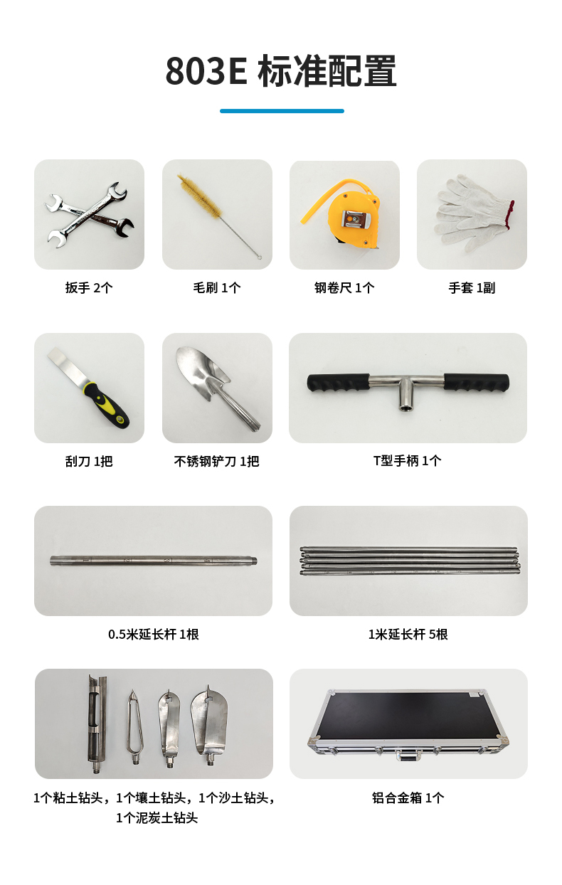 1个T型手柄、1根0.5米延长杆、5根1米延长杆、1个粘土钻头、1个壤土钻头、1个沙土钻头、1个泥炭土钻头、1把刮刀、1把不锈钢铲刀、2个扳手、1个钢卷尺、1副手套、1个毛刷、1个铝合金箱
