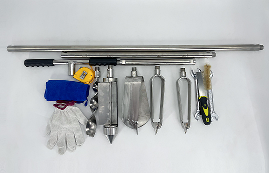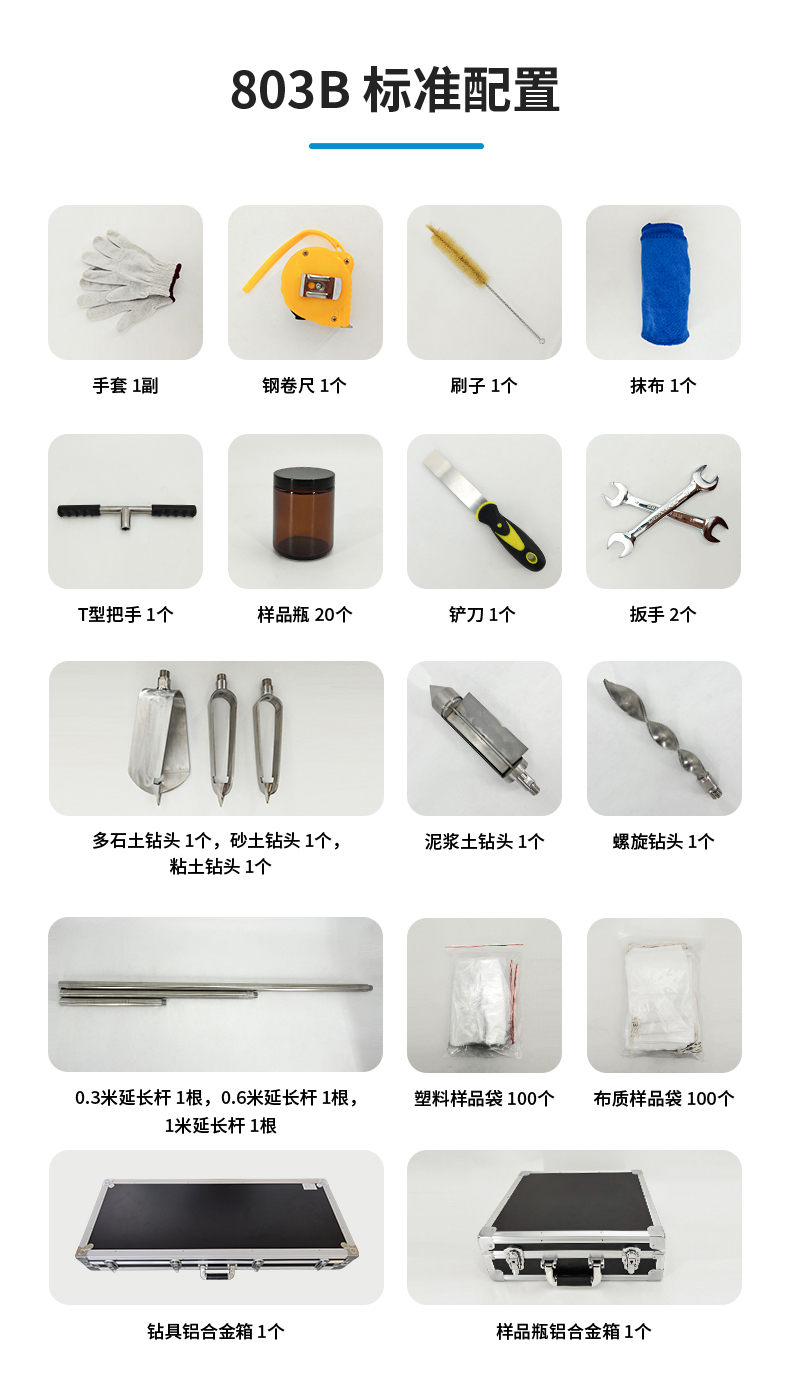 1个T型手柄、1个0.3米延长杆、1个0.6米延长杆、1个1米延长杆、1个沙土钻头、1个粘土钻头、1个多石土钻头、1个泥浆钻头、1个螺旋钻头、1把刮刀、2个扳手、1个钢卷尺、1副手套、1个毛刷、1块毛巾、100个布质样品袋、100个PVC样品袋、1箱有机样品瓶(20个/箱)、1个铝箱