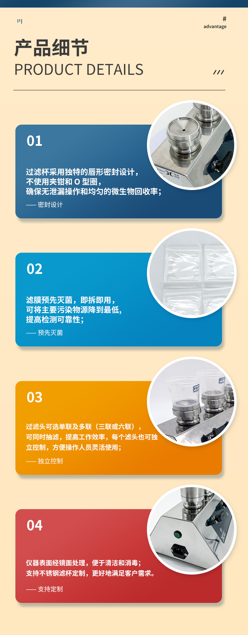三联过滤头设计,可同时抽滤,提高工作效率,每个滤头也可独立控制,方便操作人员灵活使用;